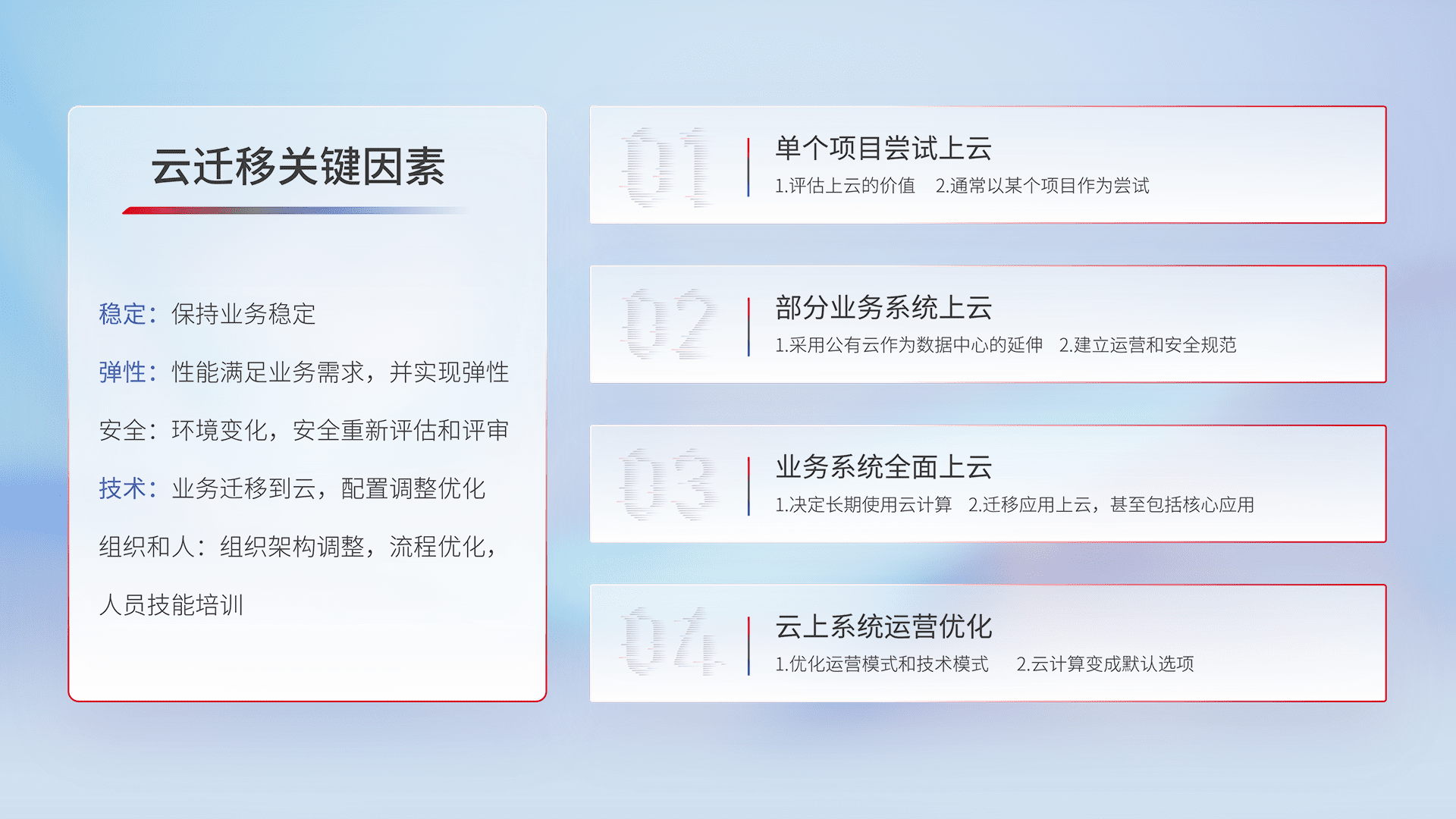 结合实际业务,,,从规划设计、、云平台选型、、、云原生改造、、、数据迁移、、、、集成交付,,,迁移全过程为客户识别最佳上云路径,,,,做好风险识别管理,,设计网络架构、、身份权限、、安全审计合规、、操作审计、、、、日志审计、、、监控告警策略、、、、多站点容灾设计等,,,对云上基础设施进行整体规划,,,,提升IT治理水平,,以满足弹性、、、、高可用、、、、高性能的需求。。