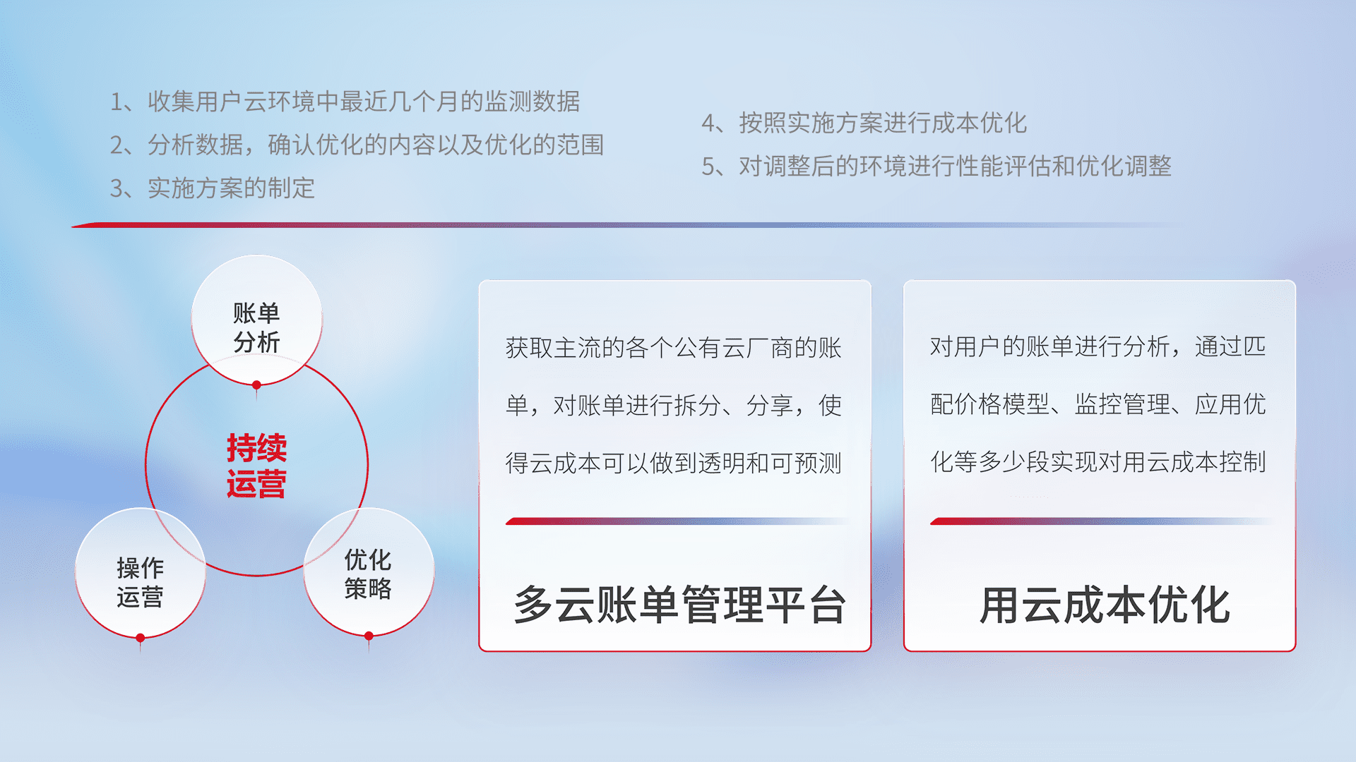 通过多云纳管,,,以统一的资源数据模型把客户的云资源进行抽象和封装,,,进而实现对多云资源的统一操作,,保障云资源管理的可靠性、、、稳定性与可用性。。。。量身定制化运维内容,,,配置、、、开发运维、、、补丁管理、、备份、、、监控、、、、认证和访问管理、、、审计和日常巡检等,,,,保障在用云过程中的可靠度,,,稳定度以及高可用率。。